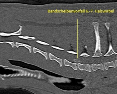 Mit unserem modernen 80-Zeiler Computertomographen (CT) der Firma Canon lässt sich die Wirbelsäule unabhängig von der Hundegröße (vom Chihuahua bis zur Deutschen Dogge) in 20-30 Sekunden untersuchen und ein Bandscheibenvorfall sehr schnell diagnostizieren.